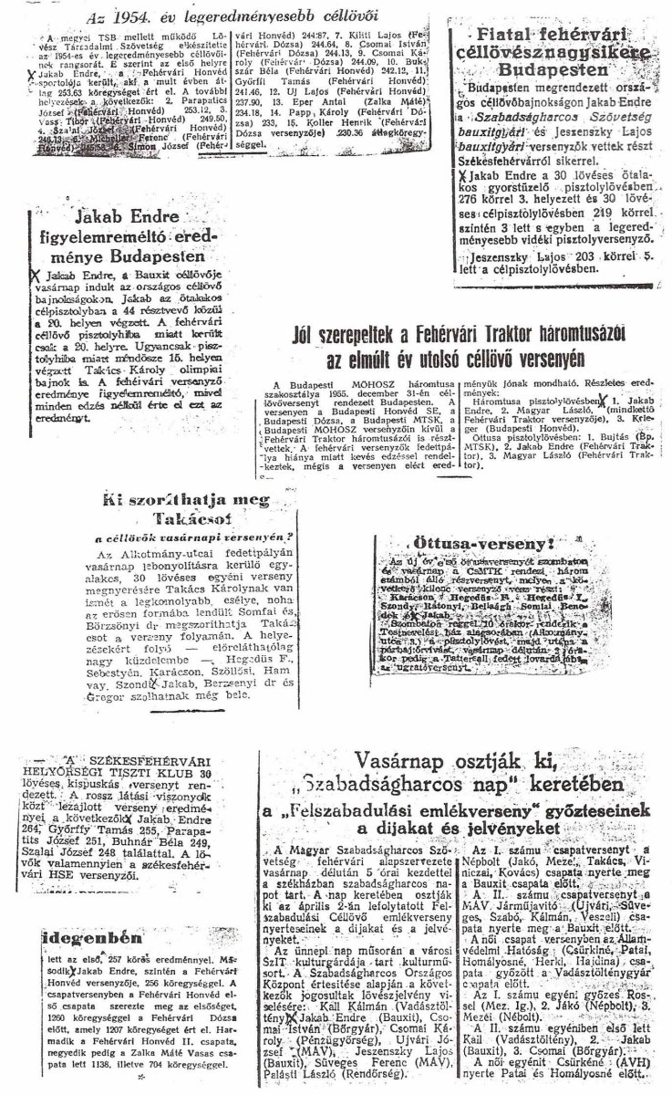 A megyei TSB mellett működő Lövész Társadalmi Szövetség elkészitette az 1954-es év legeredményesebb céllövőinek rangsorát. E szerint az első helyre Jakab Endre a Fehérvári Honvéd sportolója került, aki a múlt évben átlag 253.63 köregységet ért el. A további helyezések a következők: 2. Parapatics József (Fehérvári Honvéd) 253.12, 3. Vass Tibor (Fehérvári Honvéd) 249.50, 4. Szalai József (Fehérvári Honvéd) 240.13, 5. Micheller Ferenc (Fehérvári Honvéd) 245.58, 6. Simon József (Fehérvári Honvéd) 244.87, 7. Kiliti Lajos (Fehérvári Dózsa) 244.64, 8. Cspmai István (Fehérvári Dózsa) 244.13, 9. Csomai Károly (Fehérvári Dózsa) 244.09, 10. Bukszár Béla (Fehérvári Dózsa) 242.12, 11. Győrfi Tamás (Fehérvári Honvéd) 241.46, 12. Uj Lajos (Fehérvári Honvéd) 237.90, 13. Eper Antal (Zalka Máté)234.18, 14. Papp Károly (Fehérvári Dózsa) 233, 15. Koller Henrik (Fehérvári Dózsa) 230.36, átlagköregységgel.