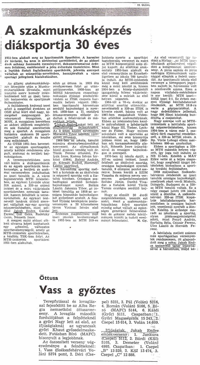 Jakab Endre a bauxit céllövője vasárnap indult az országos céllövő bajnokságokon. Jakab az ötalakos célpisztolyban a 44 résztvevő közül a 20. helyen végzett. A fehérvári céllövő pisztolyhiba miatt került csak a 20. helyre. Ugyancsak pisztolyhiba miatt mindössze 15. helyen végzett Takács Károly olimpiai bajnok is. A fehérvári versenyző eredménye figyelemreméltó mivel minden edzés nélkül érte el ezt az eredményt.