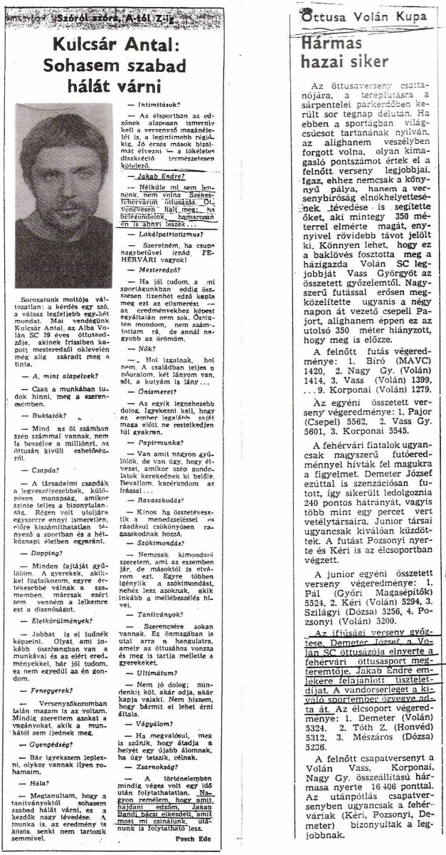 De kezdjük a történetünket az elején. Az úgy kezdődött, hogy… Jakab Endre testnevelő tanár elhatározta, amikor visszajött Székesfehérvárra tanítani, hogy a városban lesz, csakazértis lesz öttusa-sport. Pedig igencsak sokan furcsállották tervét. Öttusa, itt…? És mégis lőn, merthogy Jakab Endre elkezdte tanítani azt, ráadásul nem középiskolás fokon. Kezdetben, középiskolában, a 320-as ipari tanuló intézetben képezte a sportág „inasait” reménybeli mesterekké. Erről a bázisról nőtt ki a legendás id. Katona, Pákozdi, Johanek, Dobó csapat. A fizikai képességek mellett a „lelki” gyakorlatok is hozzájárultak a sikerhez. Ilyen volt például ama bravúr, hogy háromezer méteren a futás megkezdése előtt csupán balhéból térdelő rajttal indultak a volános fiúk, s szakították le az ellenfelet, megroggyantván azok lelkivilágát…